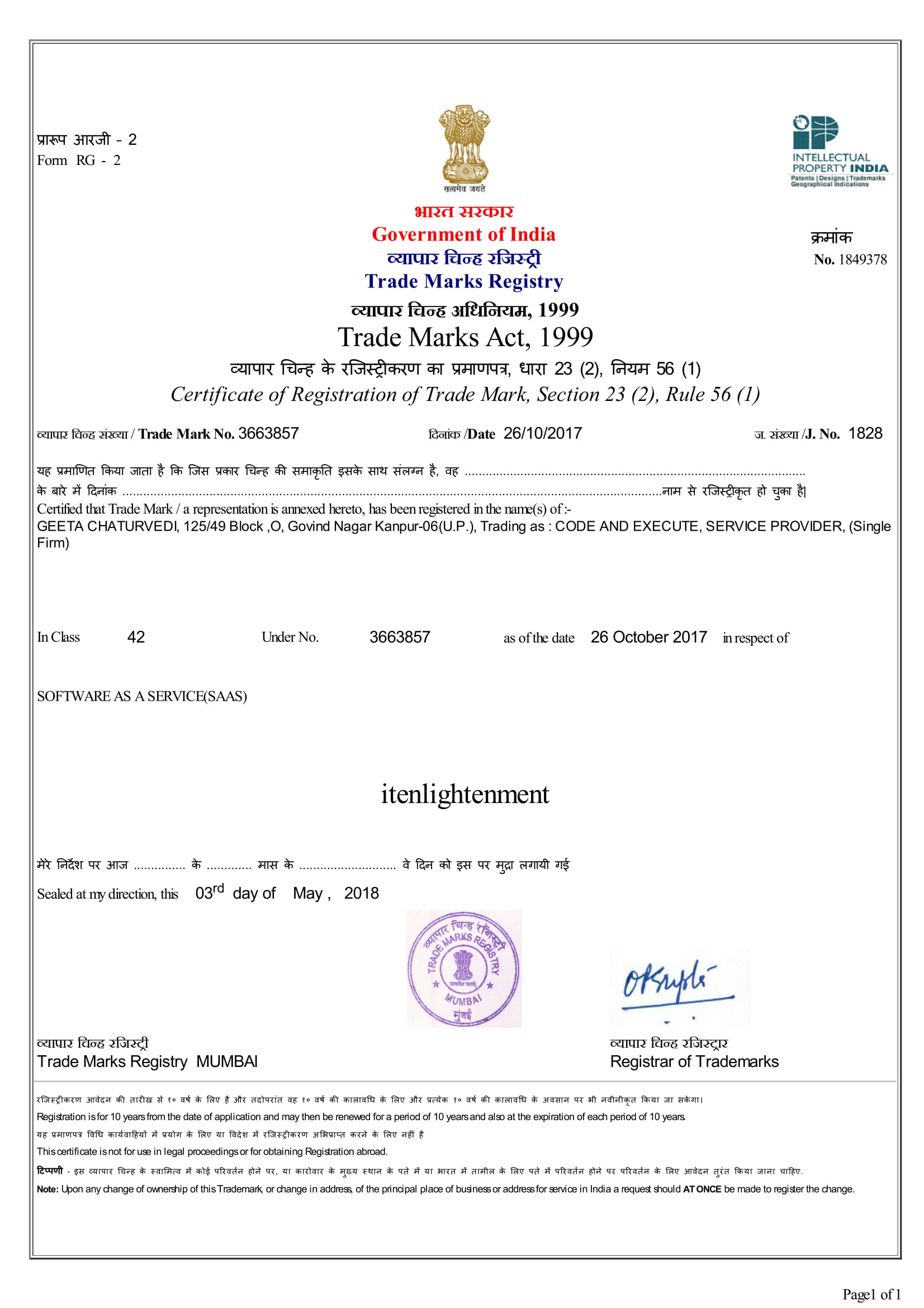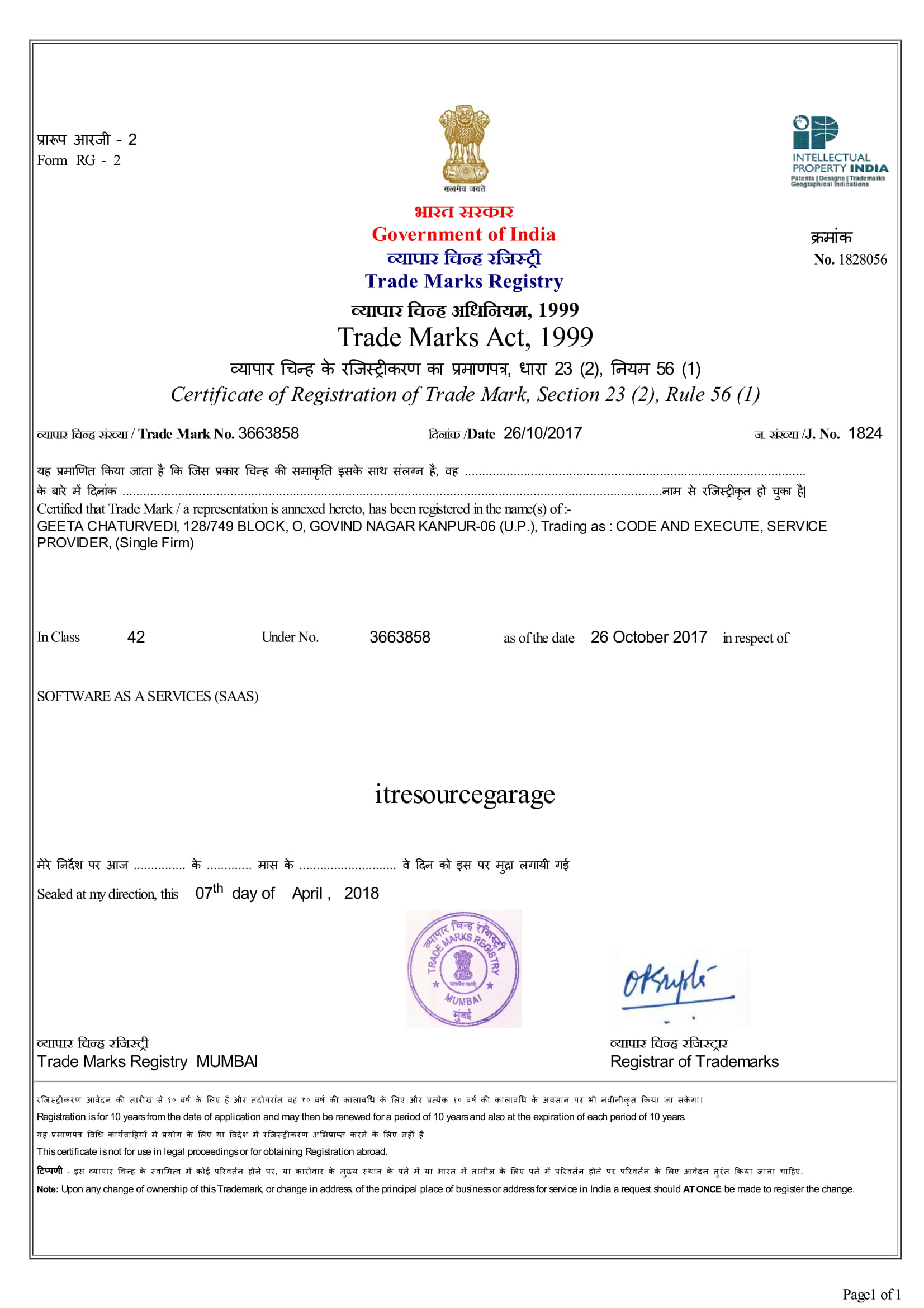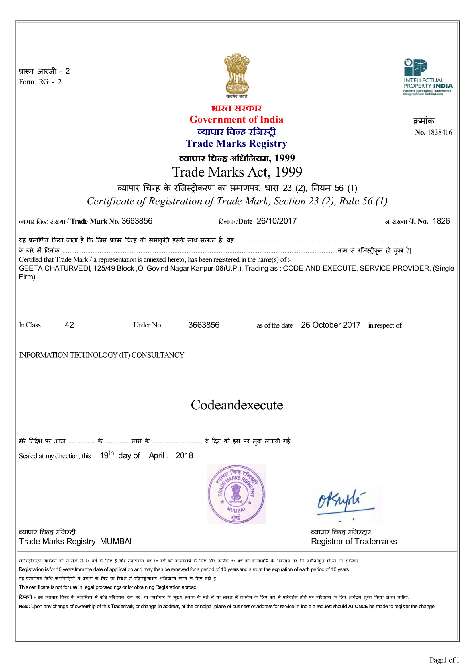 We have a Software Company Registered as CODE AND EXECUTE®,below are the Trademark Registration Certificates of some of our product and services.Received the certificate of registration within just 5 months of filing without any objection that's because the case was designed and presented very perfectly. Trademark cases are very complicated if not filed properly , you will loose to objections. Reach out to us for Trademark Registration.